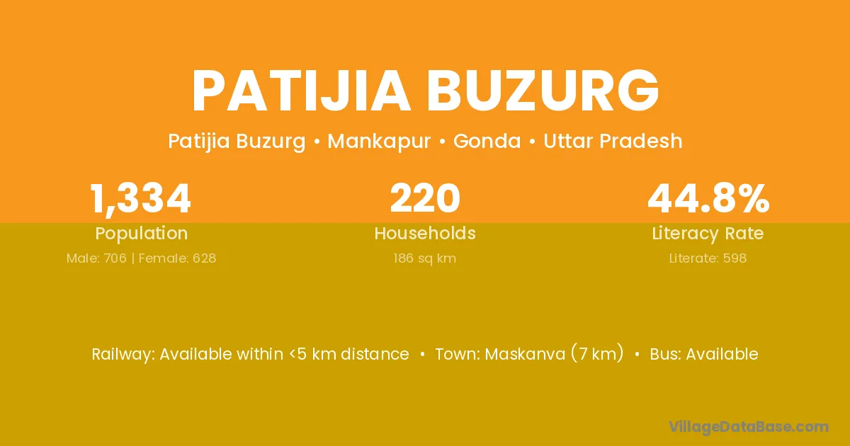 Patijia Buzurg village has a total population of 1,334 people, of which 706 are males and 628 are females.