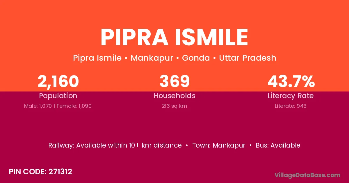 Pipra Ismile village has a total population of 2,160 people, of which 1,070 are males and 1,090 are females.
