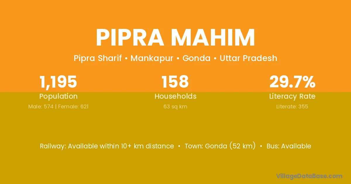 Gonda (52 km) is the nearest town to Pipra Mahim village for major economic activities and is located approximately 52 km away.