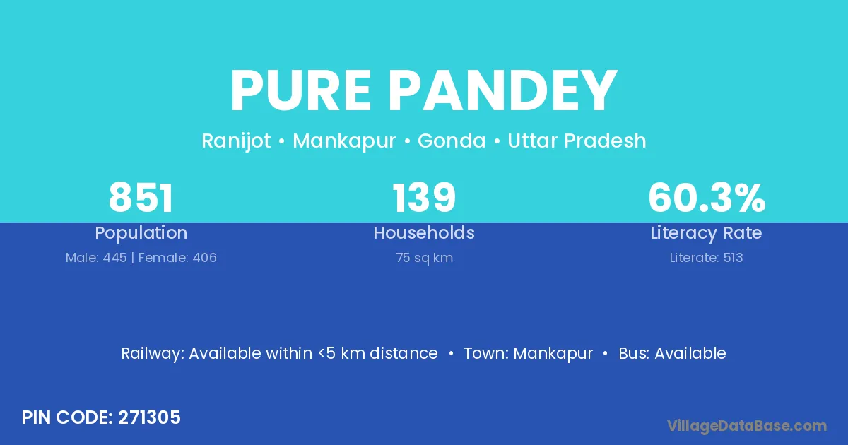 Pure Pandey village has a total population of 851 people, of which 445 are males and 406 are females.