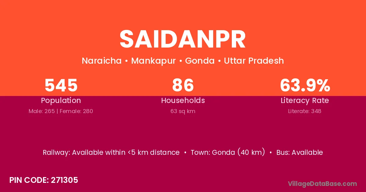 Gonda (40 km) is the nearest town to Saidanpr village for major economic activities and is located approximately 40 km away.