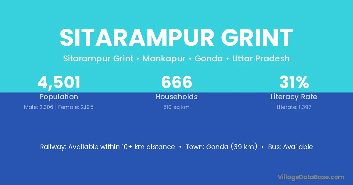 Gonda (39 km) is the nearest town to Sitarampur Grint village for major economic activities and is located approximately 39 km away.