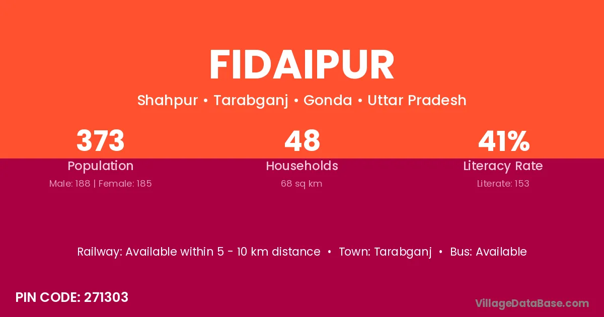Fidaipur village has a total population of 373 people, of which 188 are males and 185 are females.
