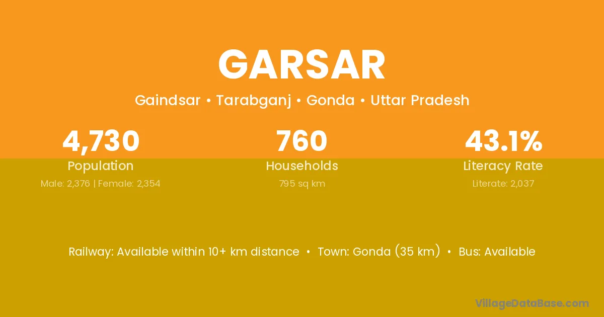 Gonda (35 km) is the nearest town to Garsar village for major economic activities and is located approximately 35 km away.
