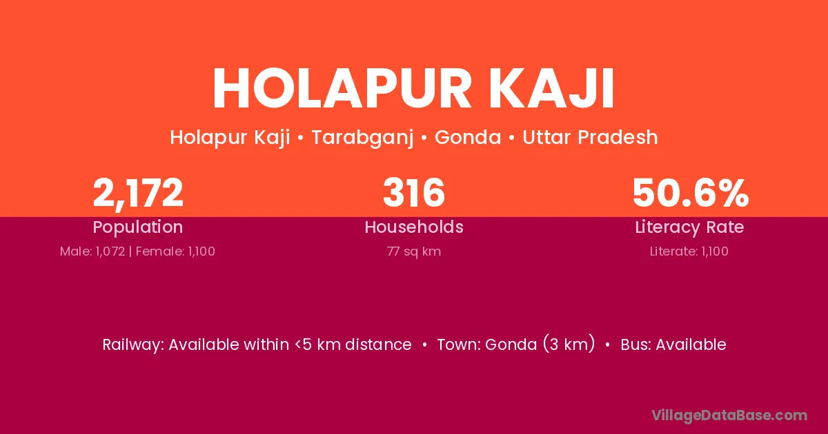 Gonda (3 km) is the nearest town to Holapur Kaji village for major economic activities and is located approximately 3 km away.