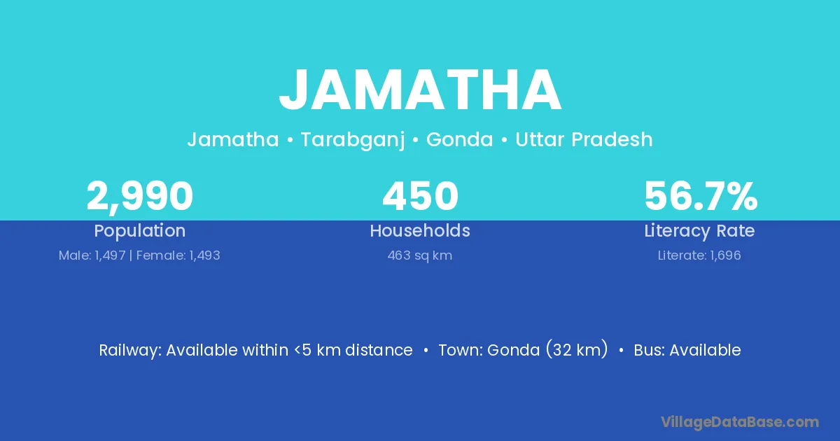 Gonda (32 km) is the nearest town to Jamatha village for major economic activities and is located approximately 32 km away.