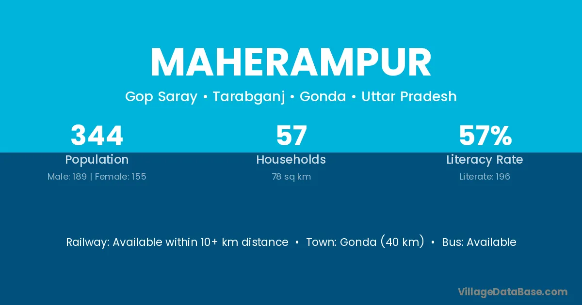Gonda (40 km) is the nearest town to Maherampur village for major economic activities and is located approximately 40 km away.