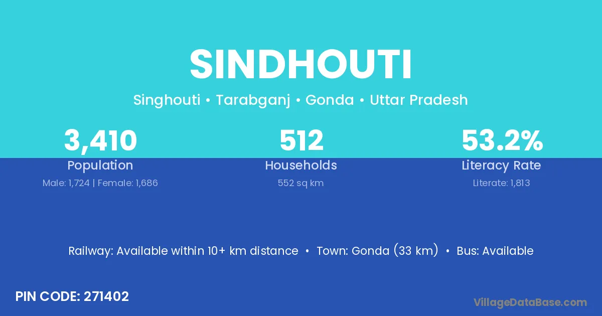 Gonda (33 km) is the nearest town to Sindhouti village for major economic activities and is located approximately 33 km away.