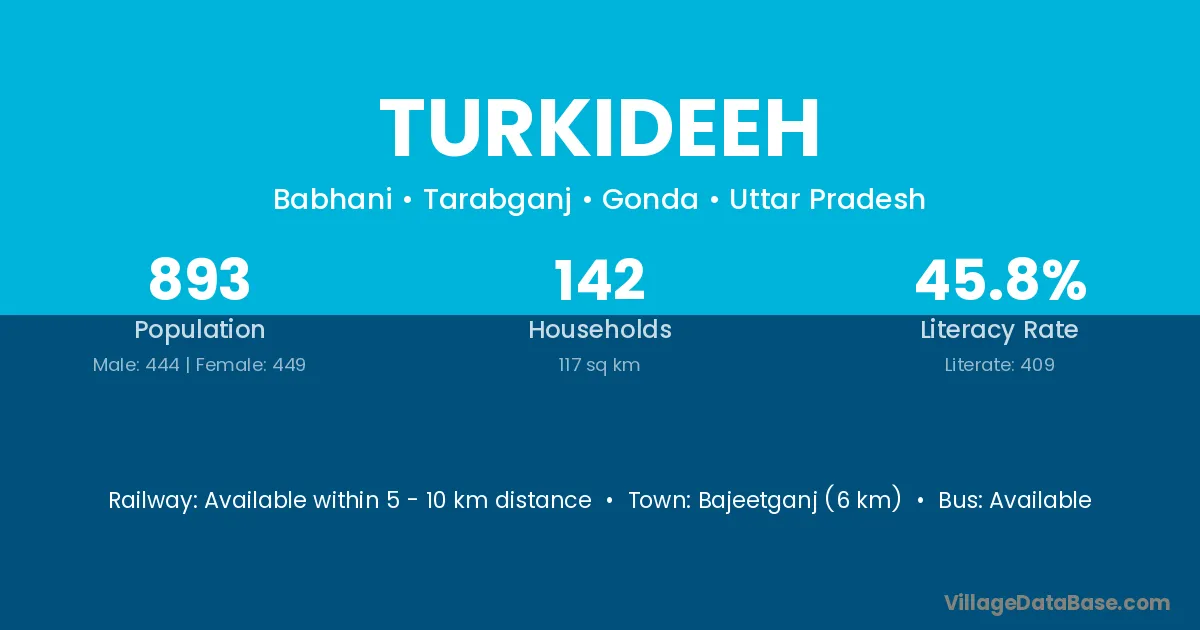 Bajeetganj (6 km) is the nearest town to Turkideeh village for major economic activities and is located approximately 6 km away.
