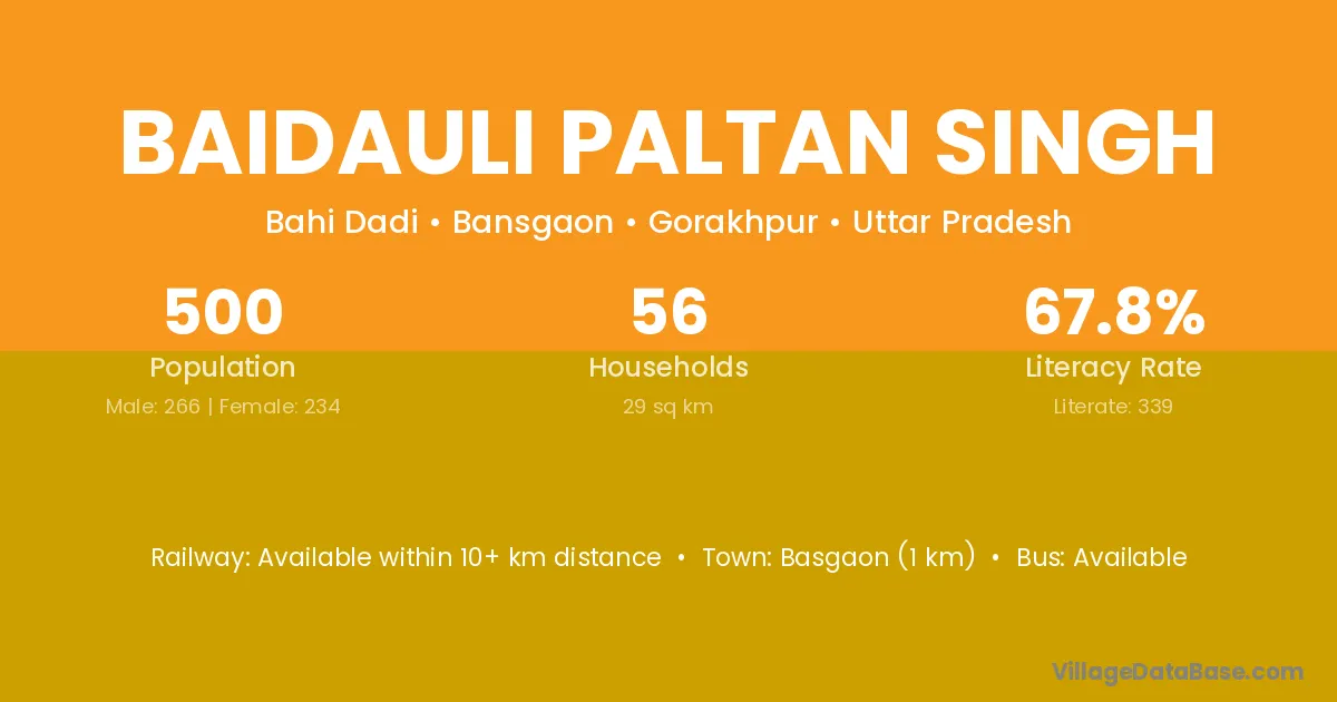 Baidauli Paltan Singh village has a total population of 500 people, of which 266 are males and 234 are females.