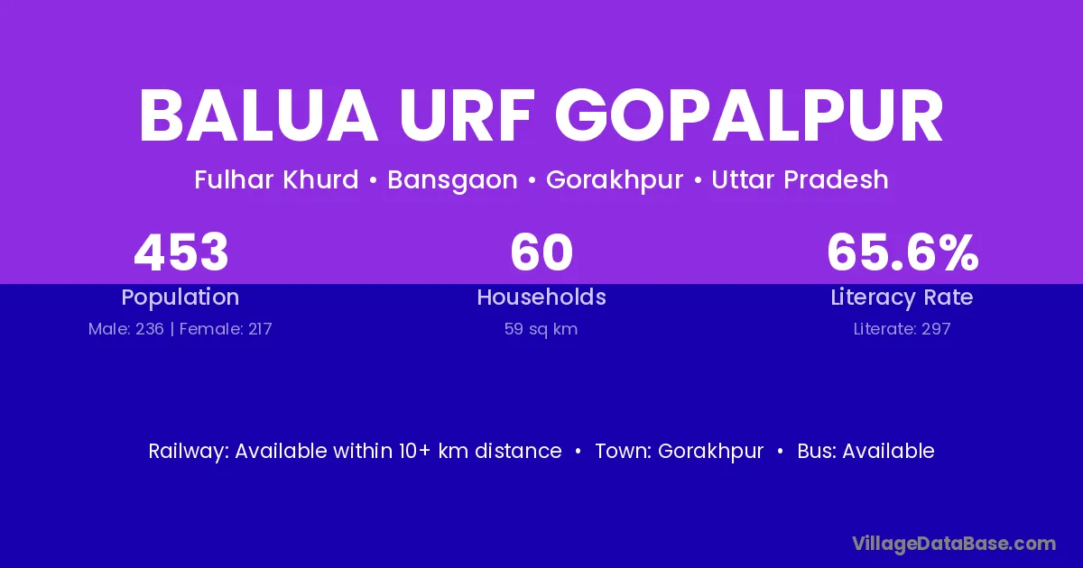 Balua Urf Gopalpur village has a total population of 453 people, of which 236 are males and 217 are females.