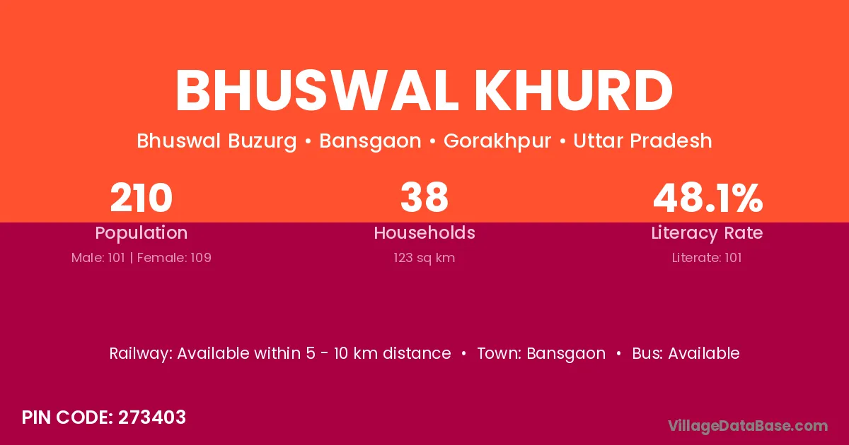 Bhuswal Khurd village has a total population of 210 people, of which 101 are males and 109 are females.