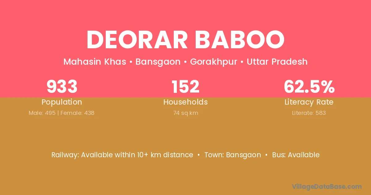 Deorar Baboo village has a total population of 933 people, of which 495 are males and 438 are females.