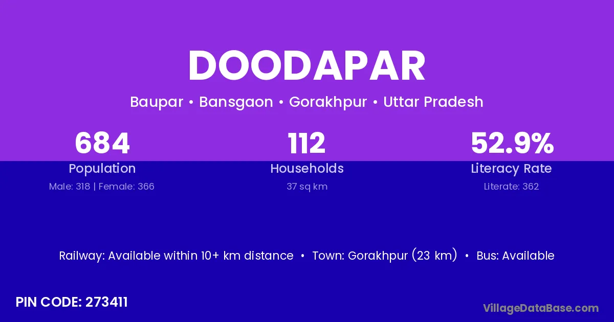 Gorakhpur (23 km) is the nearest town to Doodapar village for major economic activities and is located approximately 23 km away.