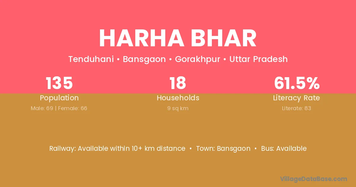 Harha Bhar village has a total population of 135 people, of which 69 are males and 66 are females.