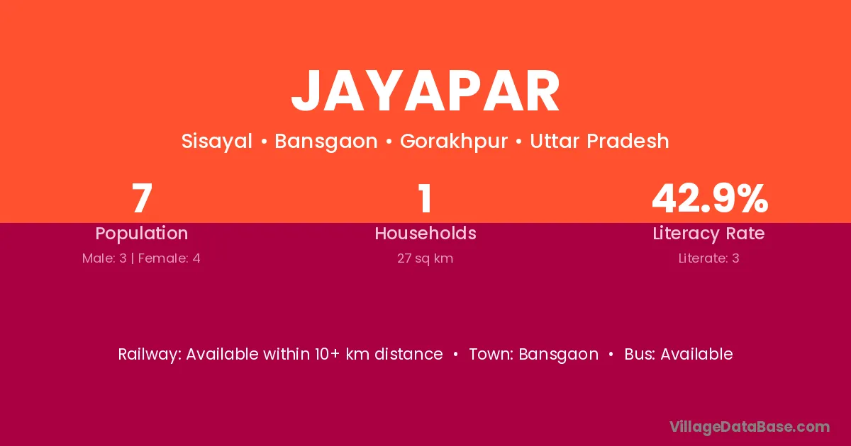 Jayapar village has a total population of 7 people, of which 3 are males and 4 are females.