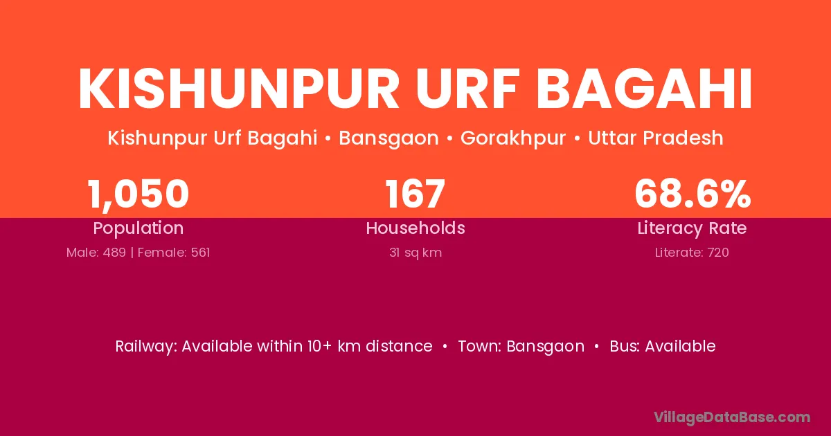 Kishunpur Urf Bagahi village has a total population of 1,050 people, of which 489 are males and 561 are females.