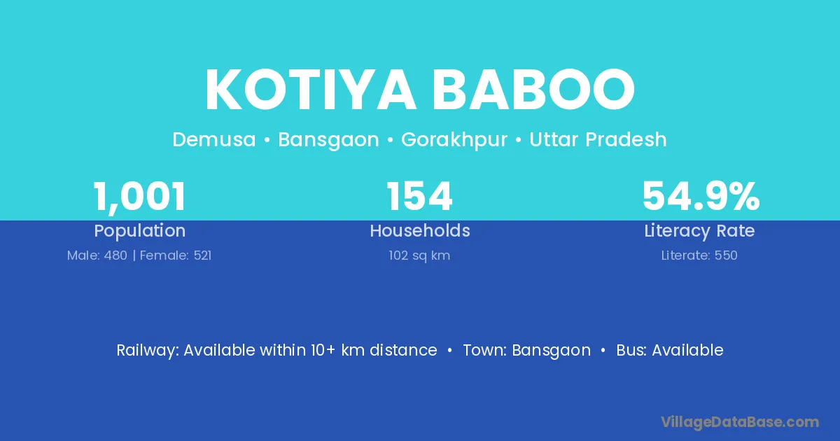 Kotiya Baboo village has a total population of 1,001 people, of which 480 are males and 521 are females.