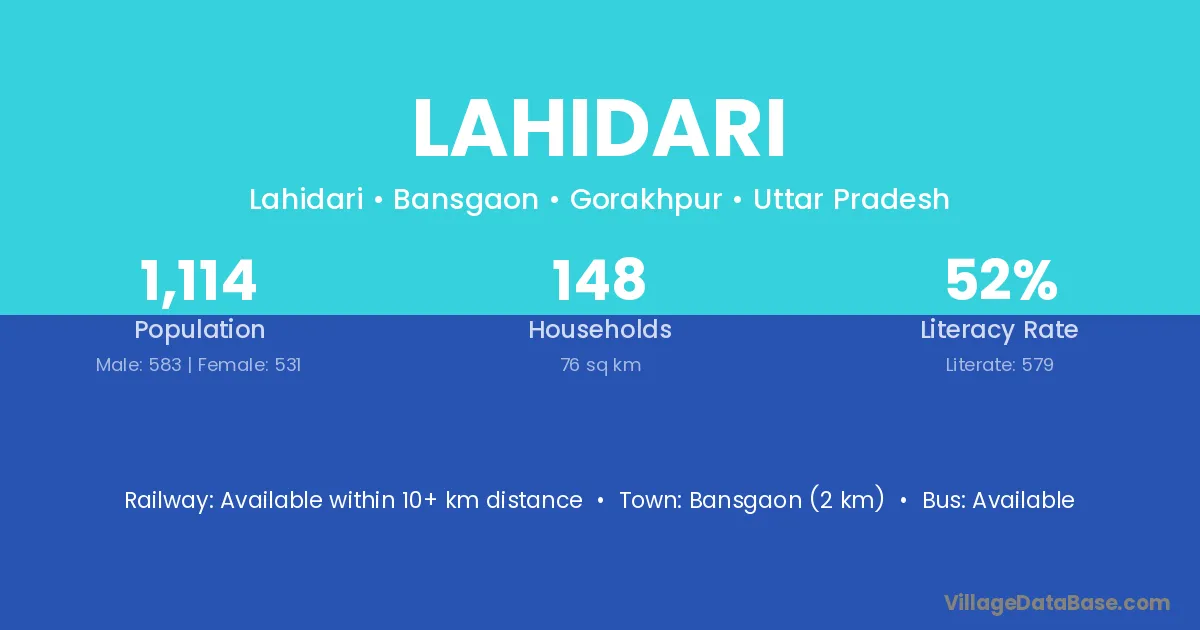 Bansgaon (2 km) is the nearest town to Lahidari village for major economic activities and is located approximately 2 km away.