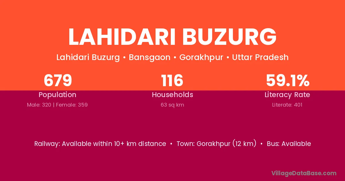 Gorakhpur (12 km) is the nearest town to Lahidari Buzurg village for major economic activities and is located approximately 12 km away.