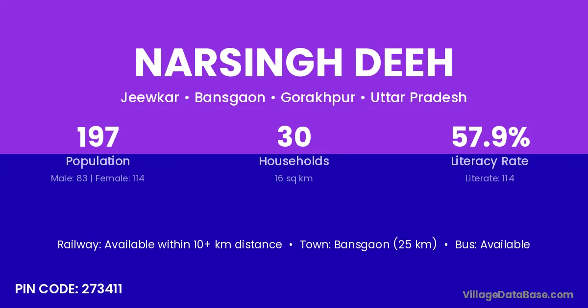 Bansgaon (25 km) is the nearest town to Narsingh Deeh village for major economic activities and is located approximately 25 km away.
