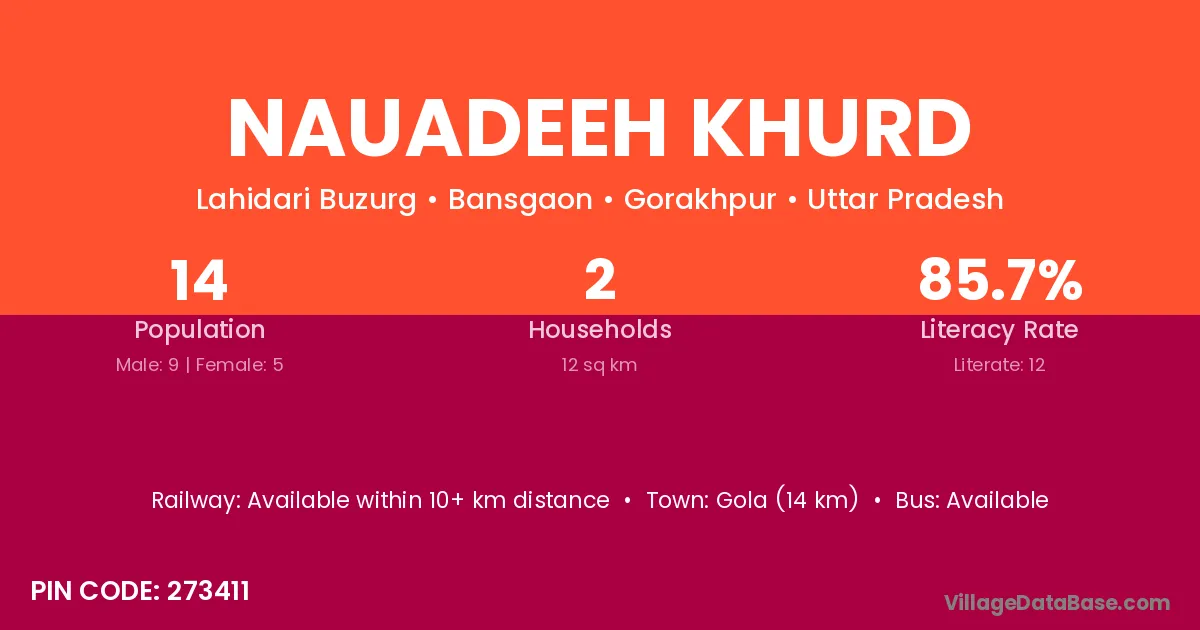 Gola (14 km) is the nearest town to Nauadeeh Khurd village for major economic activities and is located approximately 14 km away.