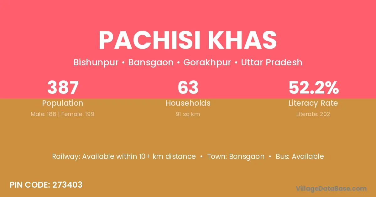 Pachisi Khas village has a total population of 387 people, of which 188 are males and 199 are females.