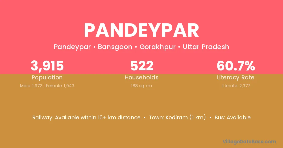 Pandeypar village has a total population of 3,915 people, of which 1,972 are males and 1,943 are females.