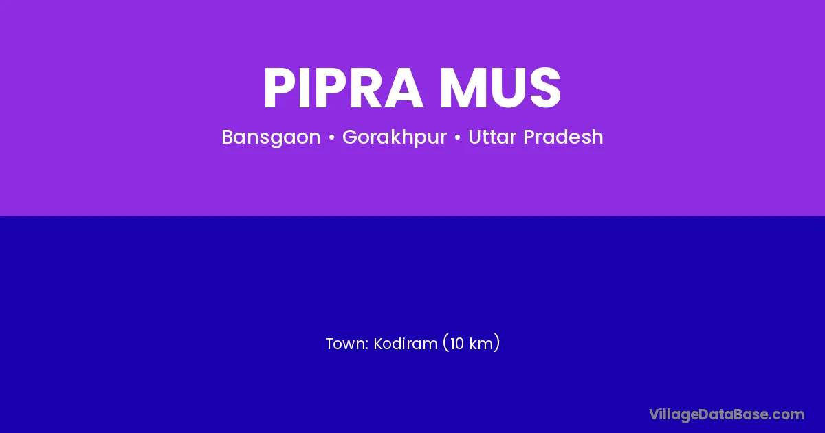 Kodiram (10 km) is the nearest town to Pipra Mus village for major economic activities and is located approximately 10 km away.