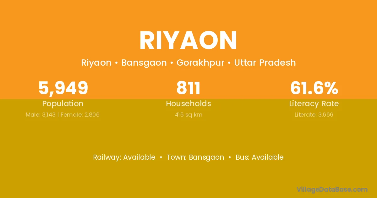Riyaon village has a total population of 5,949 people, of which 3,143 are males and 2,806 are females.