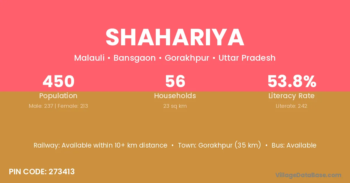 Gorakhpur (35 km) is the nearest town to Shahariya village for major economic activities and is located approximately 35 km away.