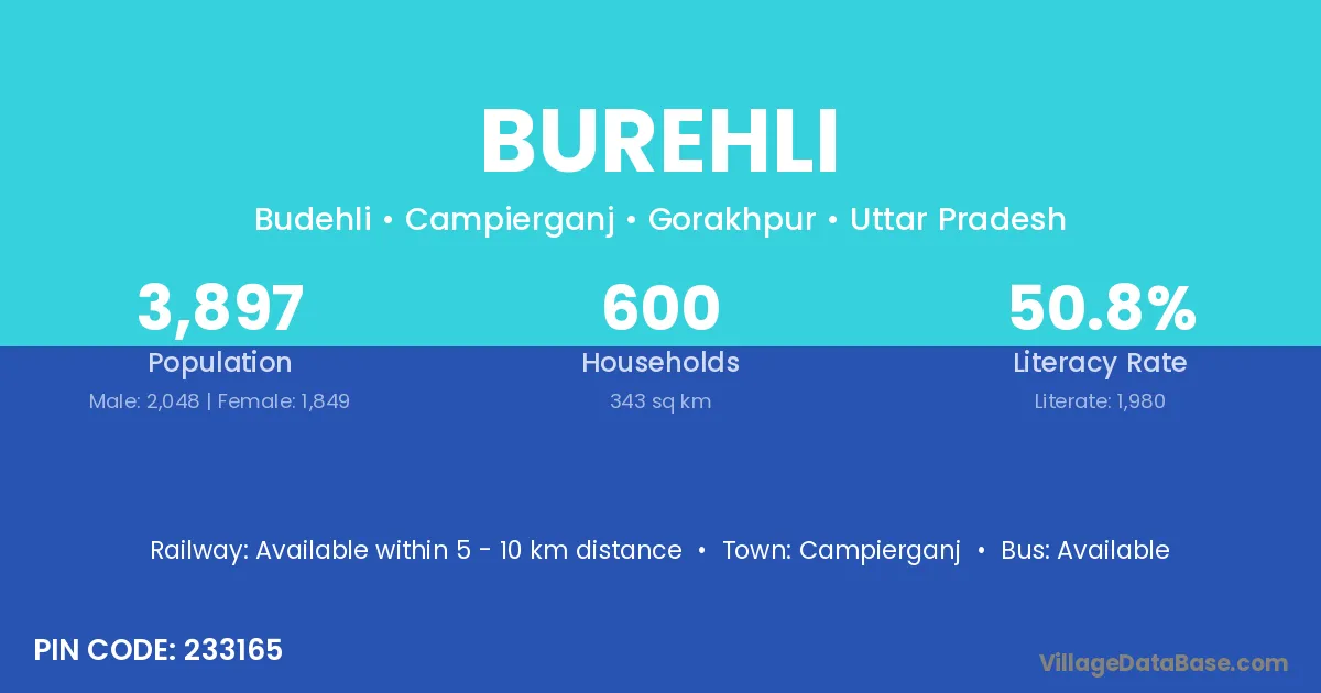 Burehli village has a total population of 3,897 people, of which 2,048 are males and 1,849 are females.
