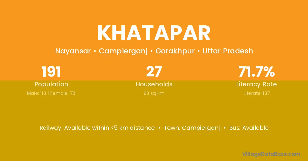 Khatapar village has a total population of 191 people, of which 113 are males and 78 are females.