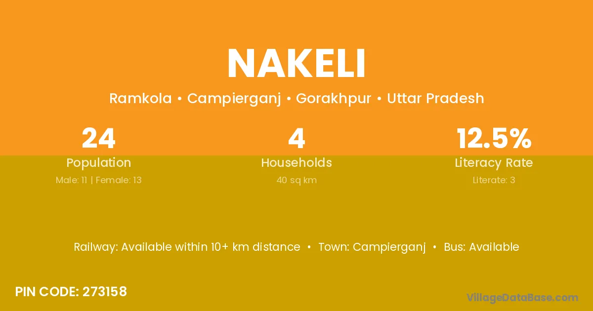 Nakeli village has a total population of 24 people, of which 11 are males and 13 are females.