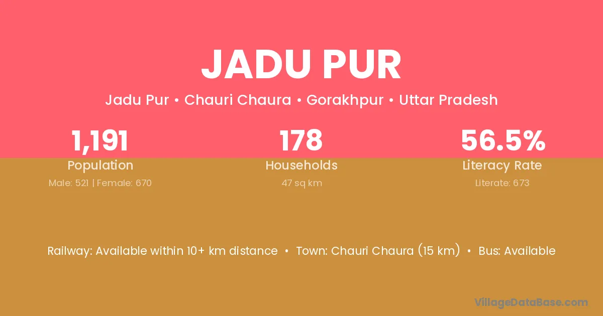 Chauri Chaura (15 km) is the nearest town to Jadu Pur village for major economic activities and is located approximately 15 km away.
