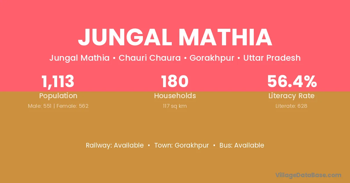 Jungal Mathia village has a total population of 1,113 people, of which 551 are males and 562 are females.