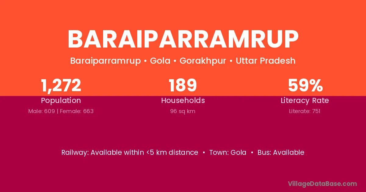 Baraiparramrup village has a total population of 1,272 people, of which 609 are males and 663 are females.