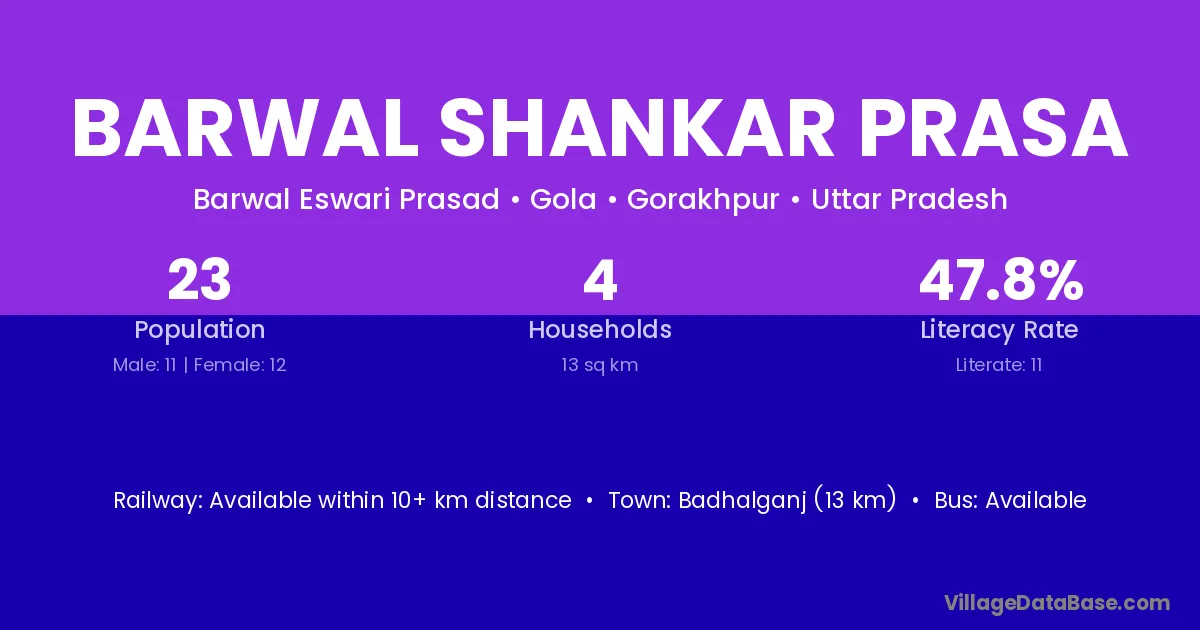 Badhalganj (13 km) is the nearest town to Barwal Shankar Prasa village for major economic activities and is located approximately 13 km away.
