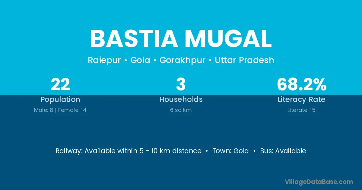 Bastia Mugal village has a total population of 22 people, of which 8 are males and 14 are females.