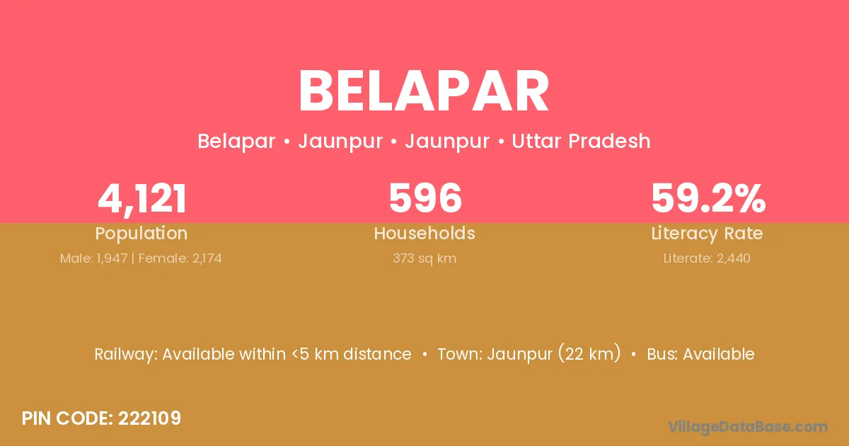 The literacy rate of Belapar village is 59.63%. Male literacy stands at 68.96% and female literacy at 50.16%.