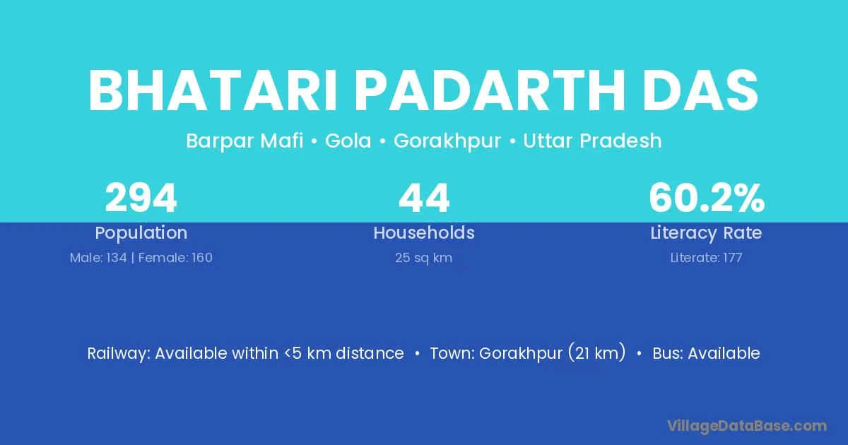 Gorakhpur (21 km) is the nearest town to Bhatari Padarth Das village for major economic activities and is located approximately 21 km away.