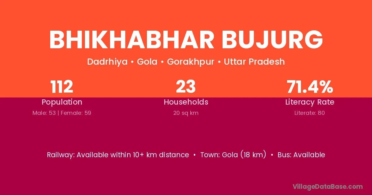 Gola (18 km) is the nearest town to Bhikhabhar Bujurg village for major economic activities and is located approximately 18 km away.