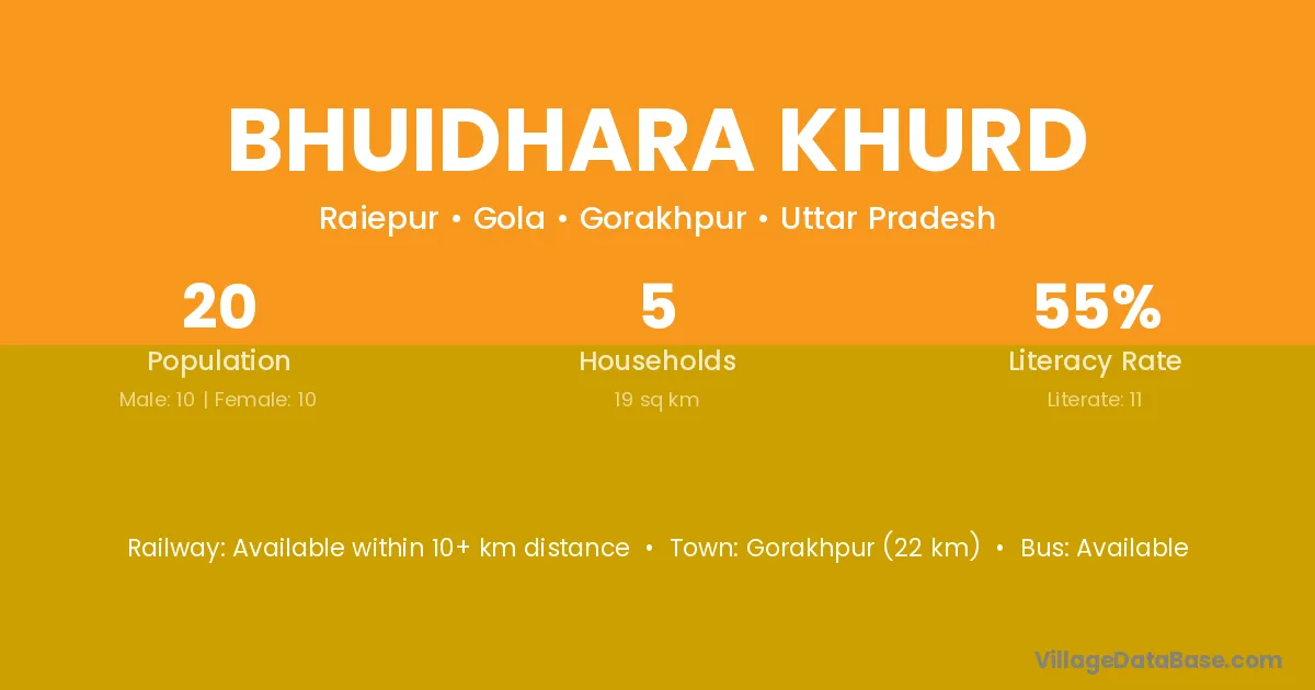 Bhuidhara Khurd village has a total population of 20 people, of which 10 are males and 10 are females.