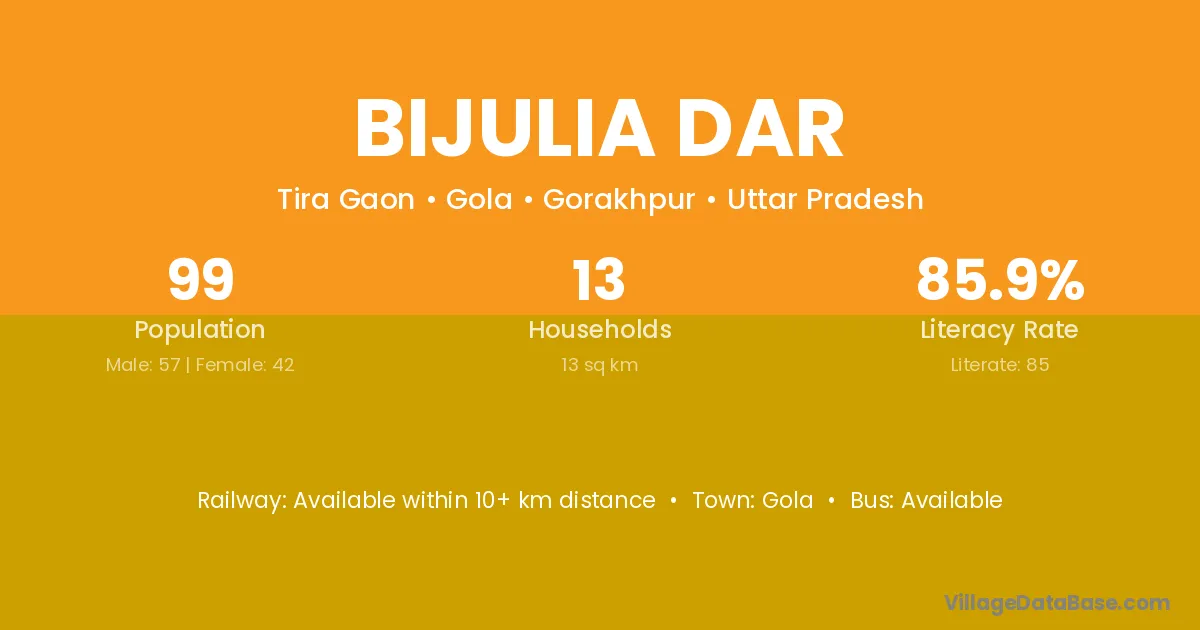 Bijulia Dar village has a total population of 99 people, of which 57 are males and 42 are females.