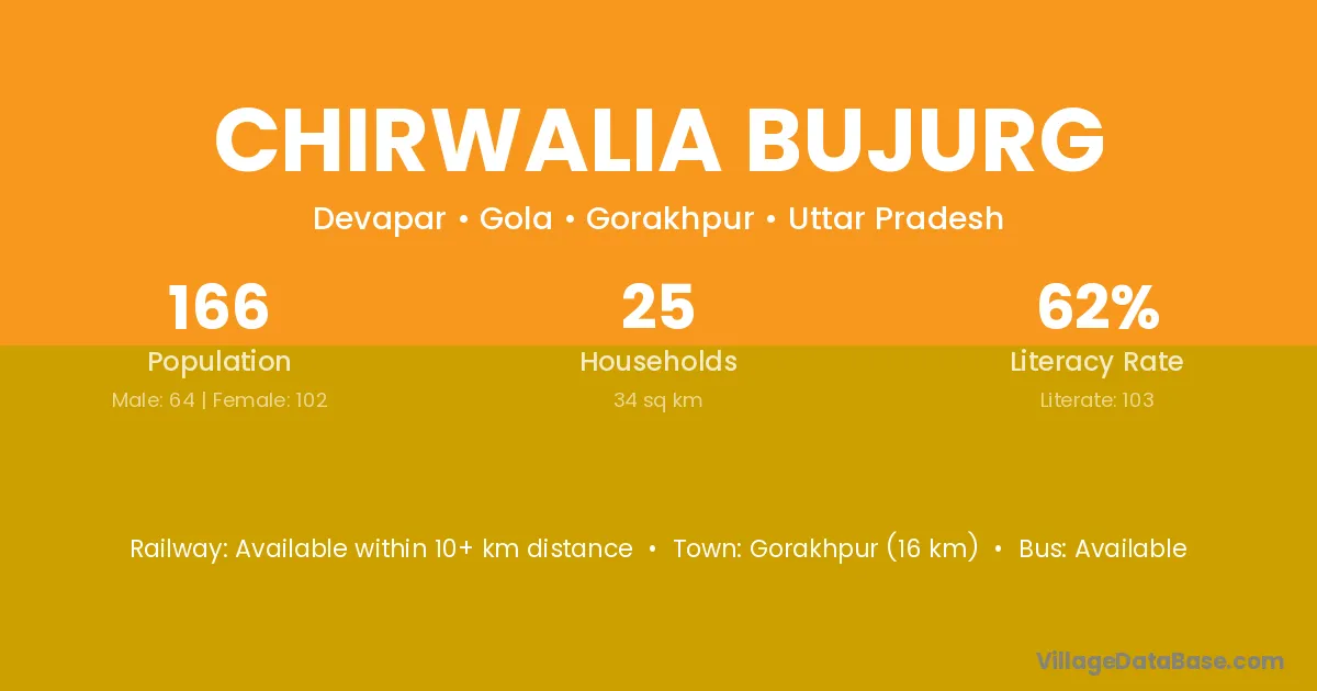 Gorakhpur (16 km) is the nearest town to Chirwalia Bujurg village for major economic activities and is located approximately 16 km away.
