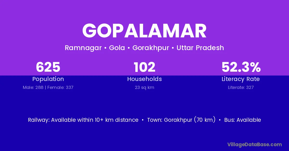 Gorakhpur (70 km) is the nearest town to Gopalamar village for major economic activities and is located approximately 70 km away.