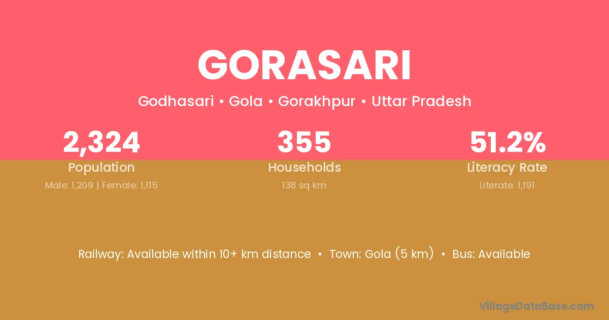 Gola (5 km) is the nearest town to Gorasari village for major economic activities and is located approximately 5 km away.
