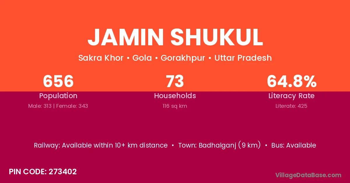 The literacy rate of Jamin Shukul village is 64.79%. Male literacy stands at 76.04% and female literacy at 54.52%.
