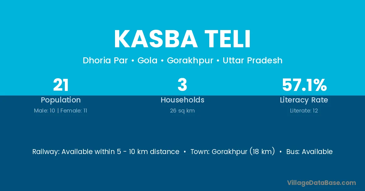 Kasba Teli village has a total population of 21 people, of which 10 are males and 11 are females.
