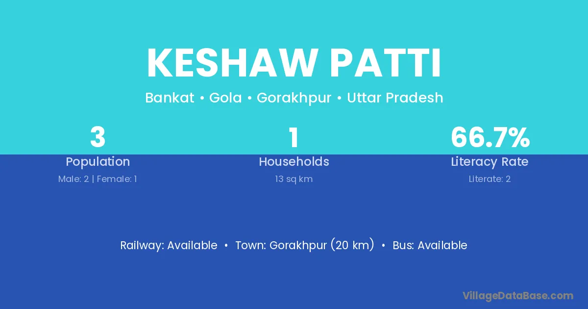 Keshaw Patti village has a total population of 3 people, of which 2 are males and 1 are females.